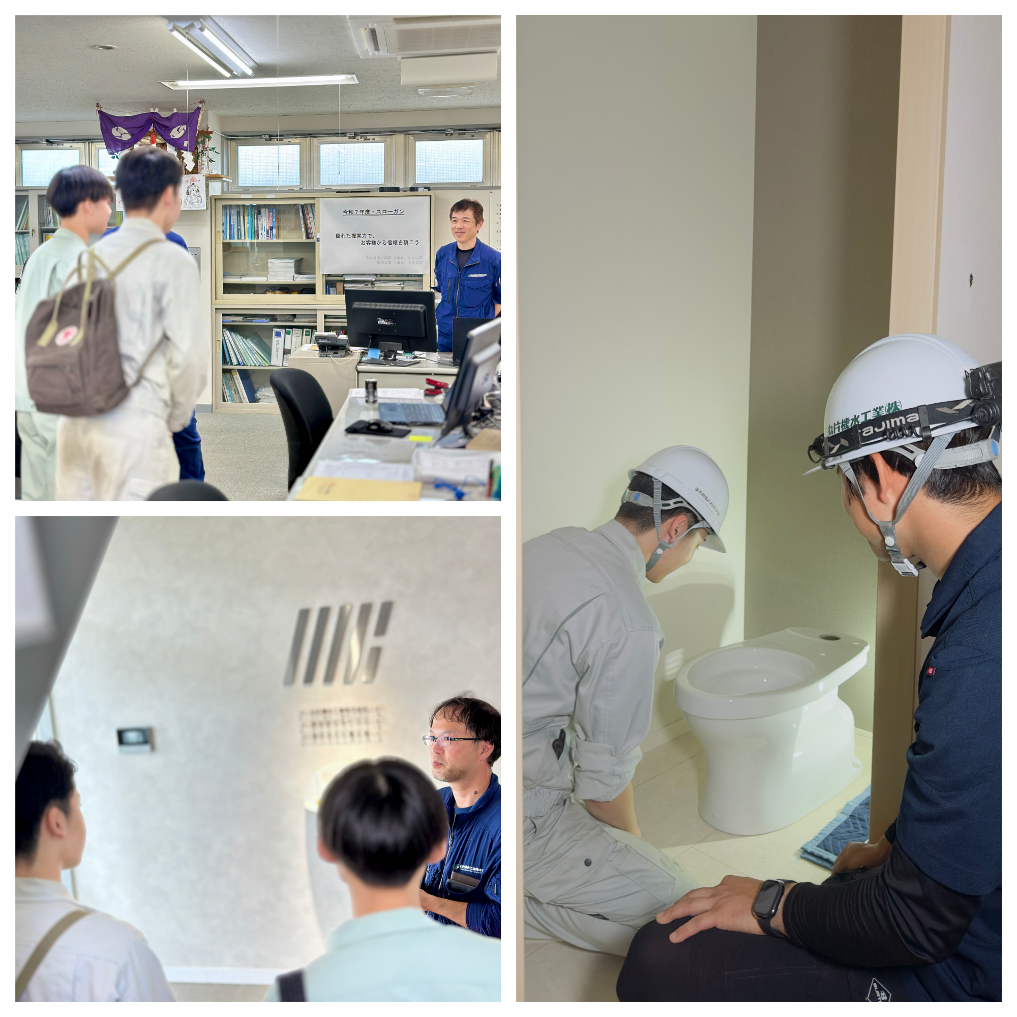 午前中は新築住宅や工場の増築現場を見学し、午後は統合北上中学校新築工事に同行しました。新築住宅では、弊社の指導のもとでトイレのユニット取り付けを体験しました。