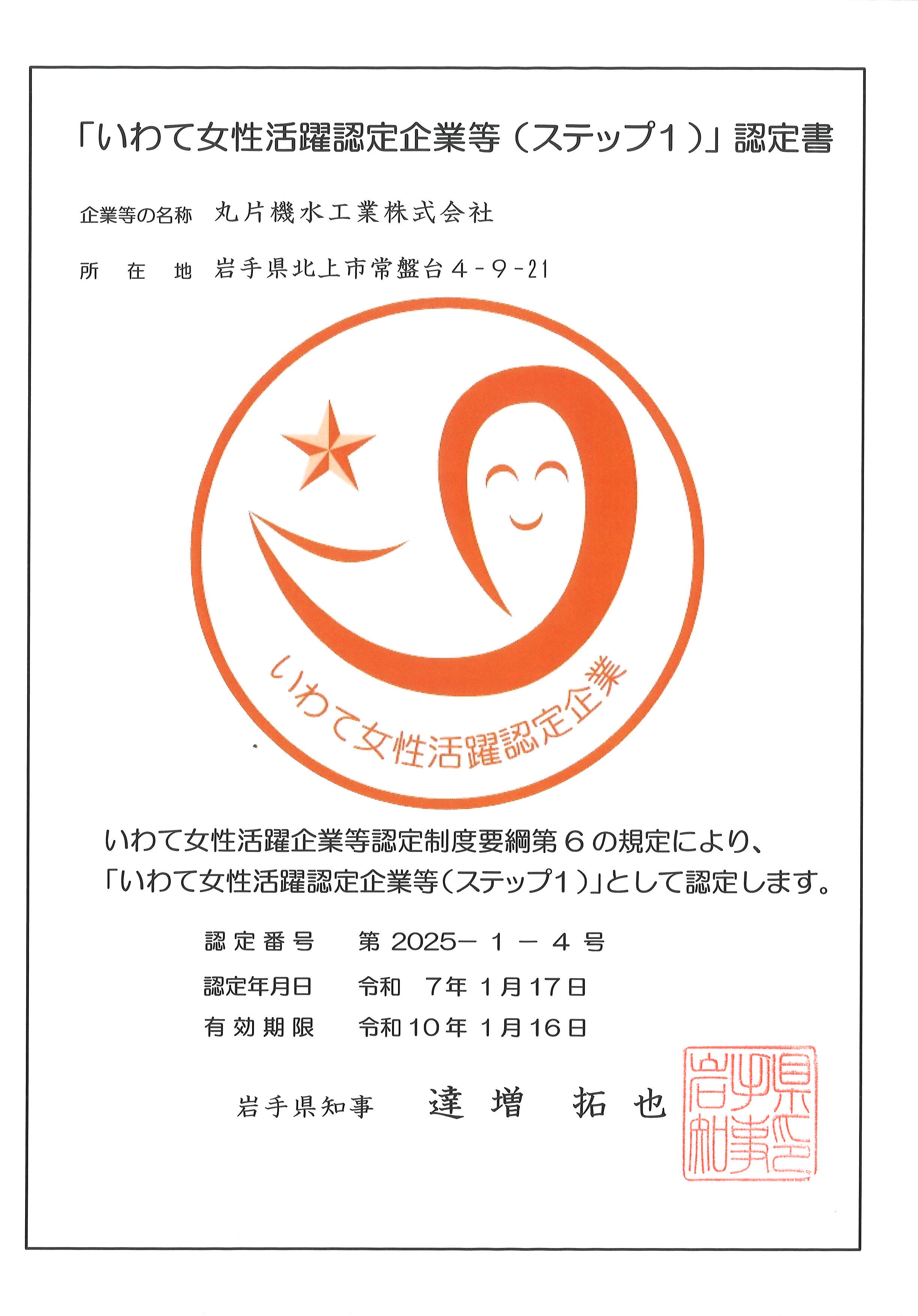この度弊社は、「いわて女性活躍認定企業(ステップ1)」として認定していただきました。この認定は、女性が活躍できる職場環境づくりに向けた取り組みが評価されたものです。