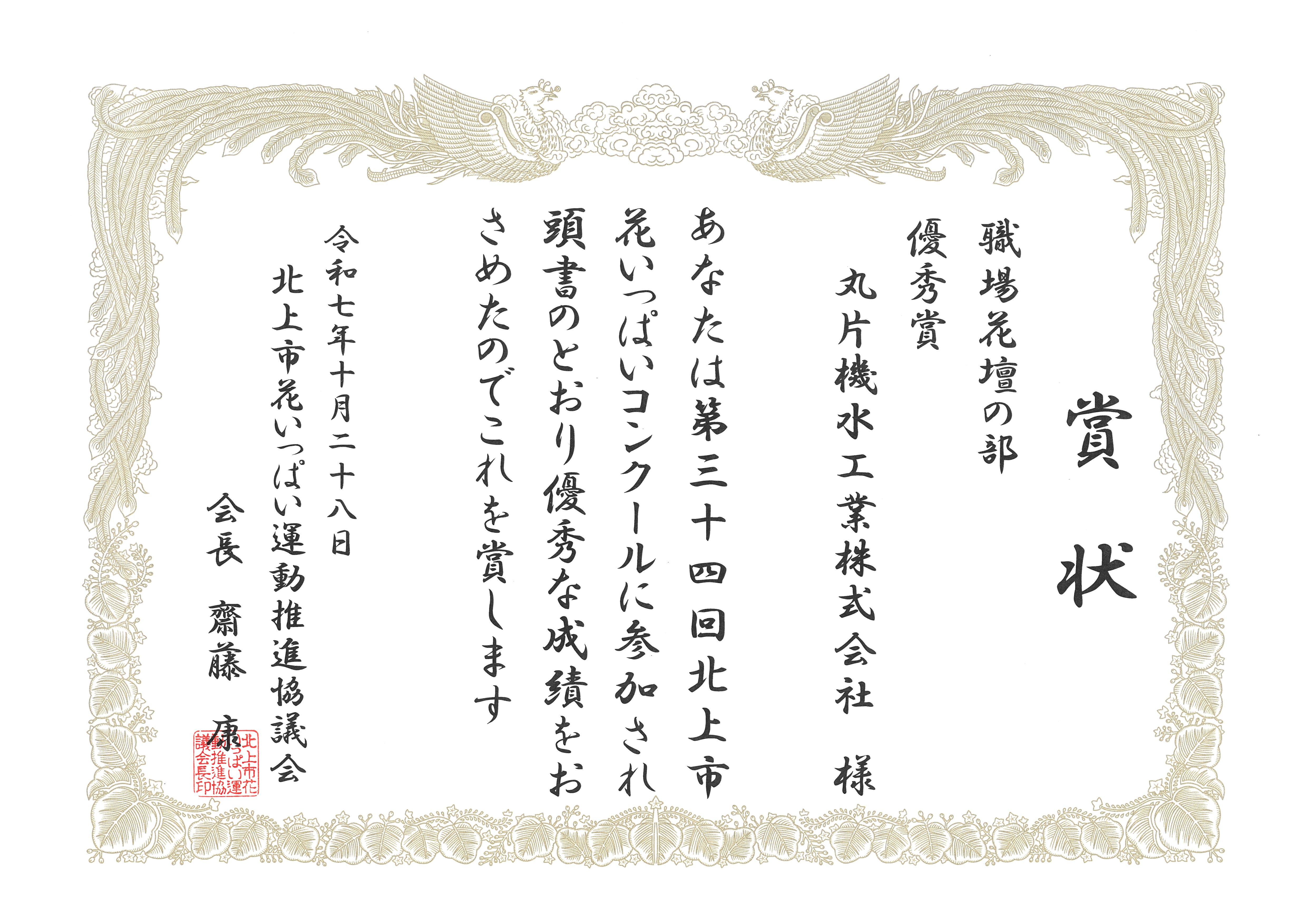 10月28日、日本現代詩歌文学館にて開催された第34回花いっぱいコンクール表彰式において、弊社は職場花壇の部にて優秀賞を受賞いたしました。