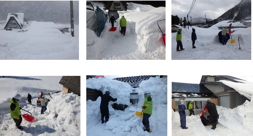 弊社から4名の社員が参加しましたが、例年にない豪雪に大変驚きました。1階部分がほぼ埋まるほどの雪の壁を、除雪機とスコップを使いながら、なんとか道路から家屋まで到達。その後、安全を確保しながら屋根の雪下ろしをしました。