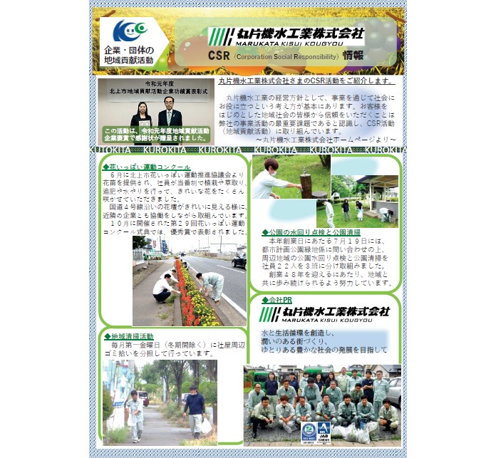 北上市広報誌に掲載されました。2020年12月9日 12月1日発行の北上市市民活動情報センターNEWS11月号に、弊社の地域貢献活動について掲載されております。 弊社の経営方針である“事業を通じて社会のお役に立つ”という考えに基づき、日頃から行っている花いっぱい運動や、公園の水回り点検、地域清掃活動について取り上げていただきました。 ぜひ多くの方にご覧いただき、弊社の地域貢献活動にご理解賜りますと幸いです。 今後も社員一同美しい環境づくりに努めてまいります。 次の記事 前の記事 新着情報一覧へ戻る