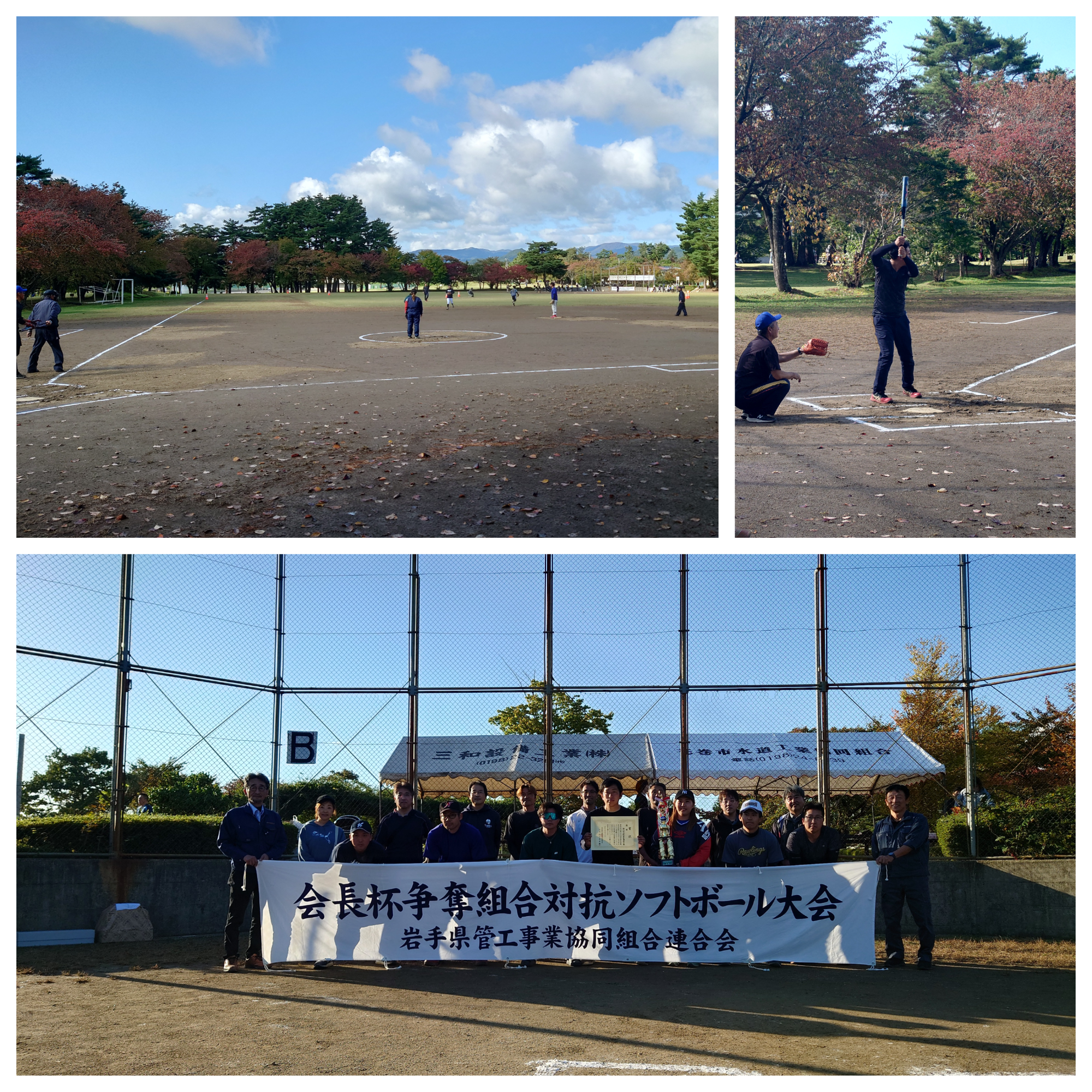 10月17日金曜日、花巻市日居城野多目的広場において開催された、第22回会長杯争奪組合対抗ソフトボール大会に参加いたしました。弊社は北上市水道組合チームの一員として出場し、全5チームによるリーグ戦にて見事勝利を収めることができました。